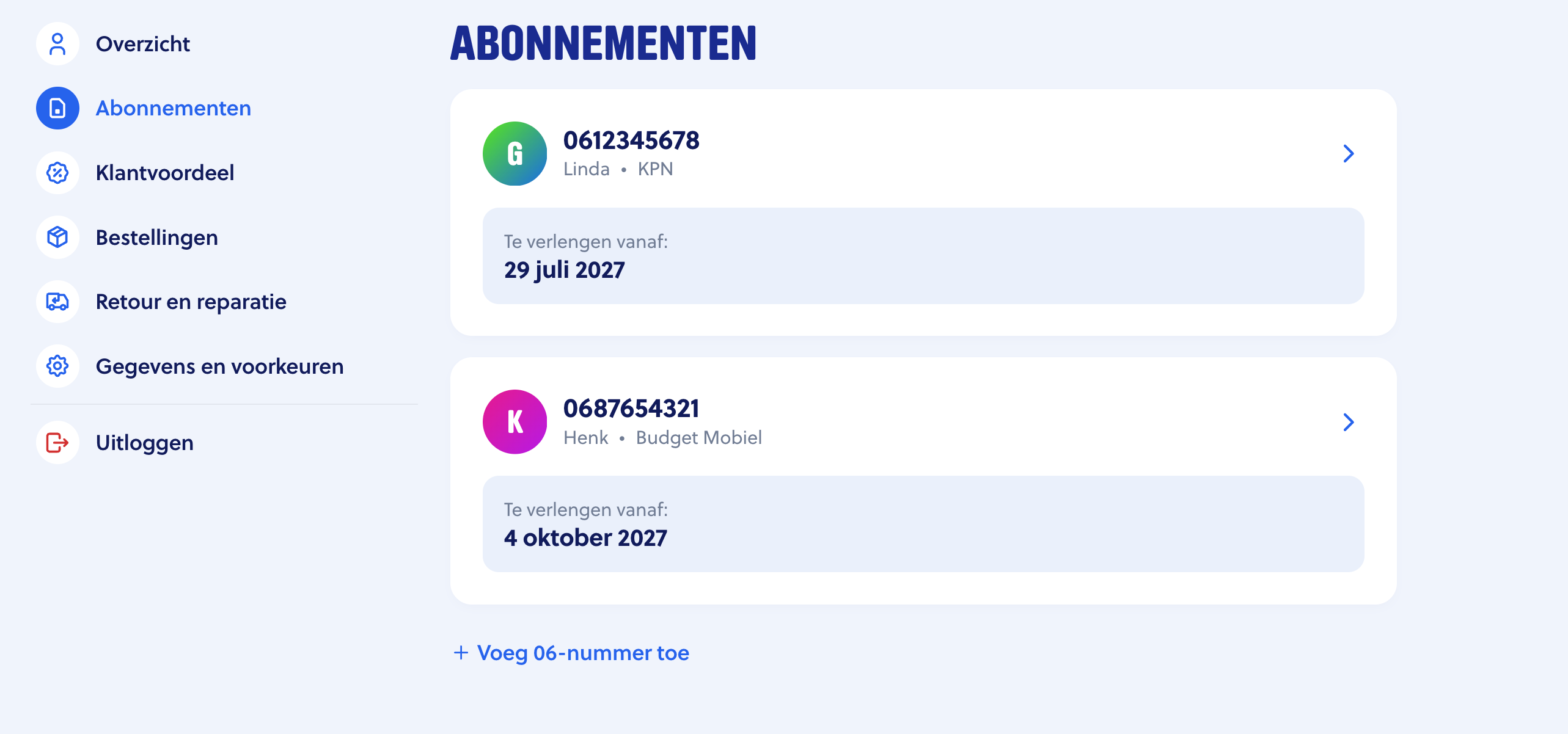 Voeg nog een 06-nummer toe aan jouw account en check eenvoudig wanneer diegene mag verlengen of overstappen. Ontvang € 30,- aan telefoonaccessoires naar keuze cadeau bij verlengen. Zie voorwaarden.